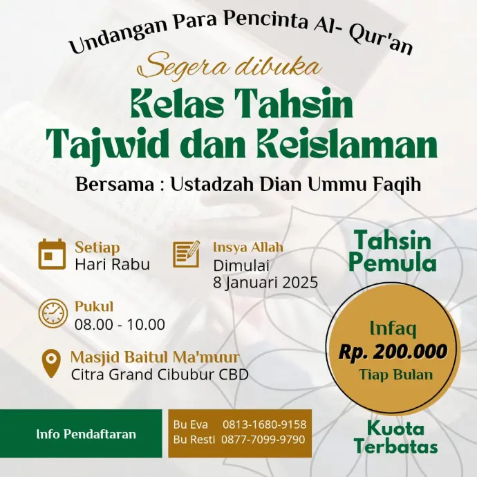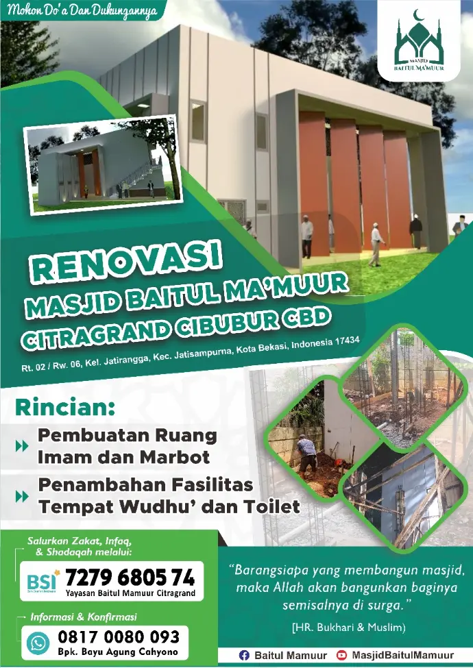 Saat ini kami menerima donasi untuk renovasi Masjid Baitul Ma'muur Citragrand CBD Cibubur.